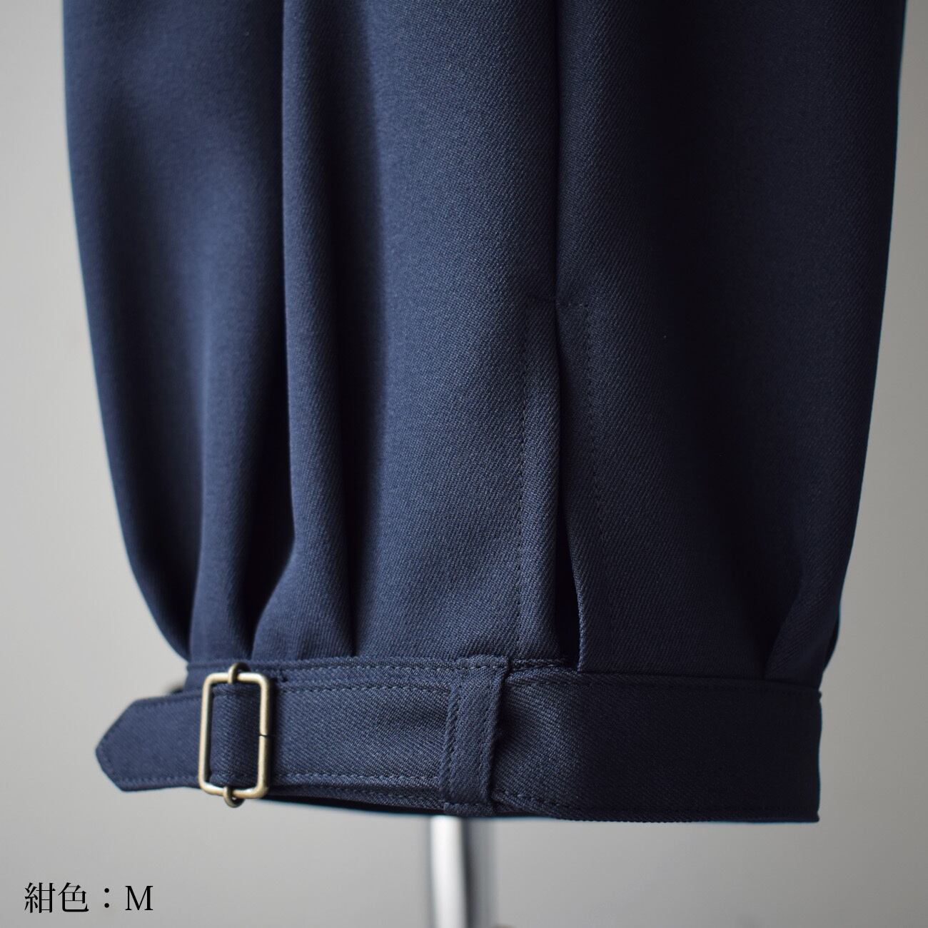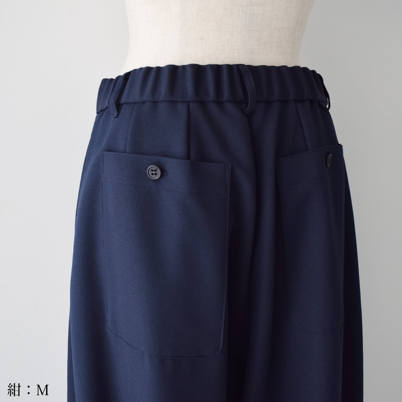 ウエスト前のタックは、お腹周りをすっきりと見せつつ、渡りにしっかりと生地分量をとれるように太めの2タックで、