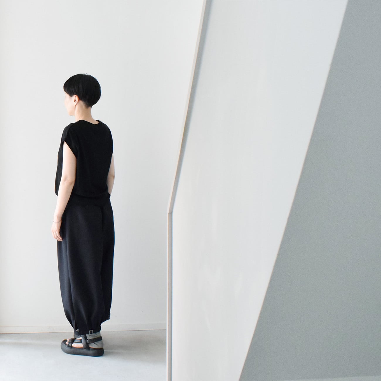 バルーンシルエットと深めの股上にウエストのタックを掛け合わせ、ちょっとボーイズライクなかわいらしさを感じさせるデザインです。