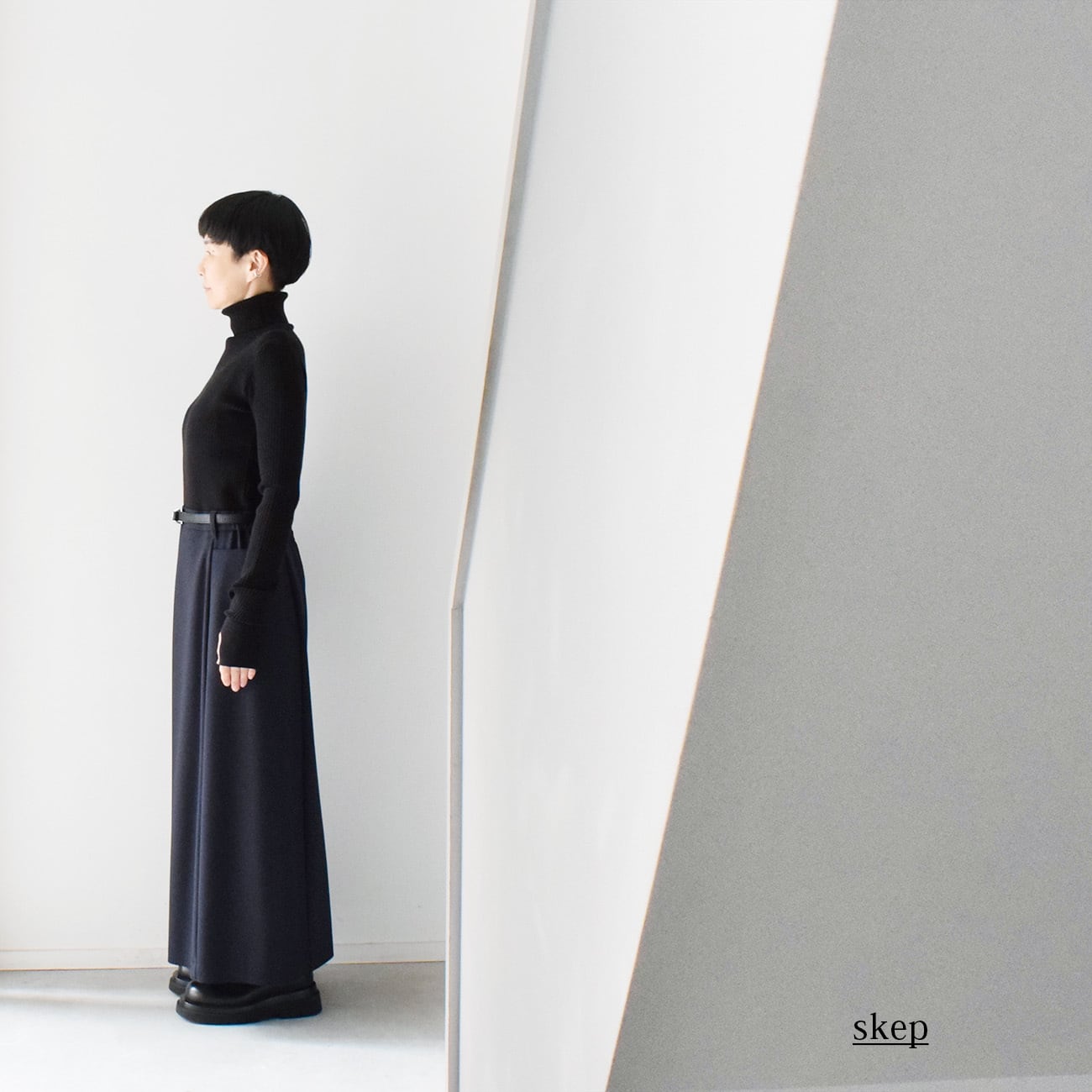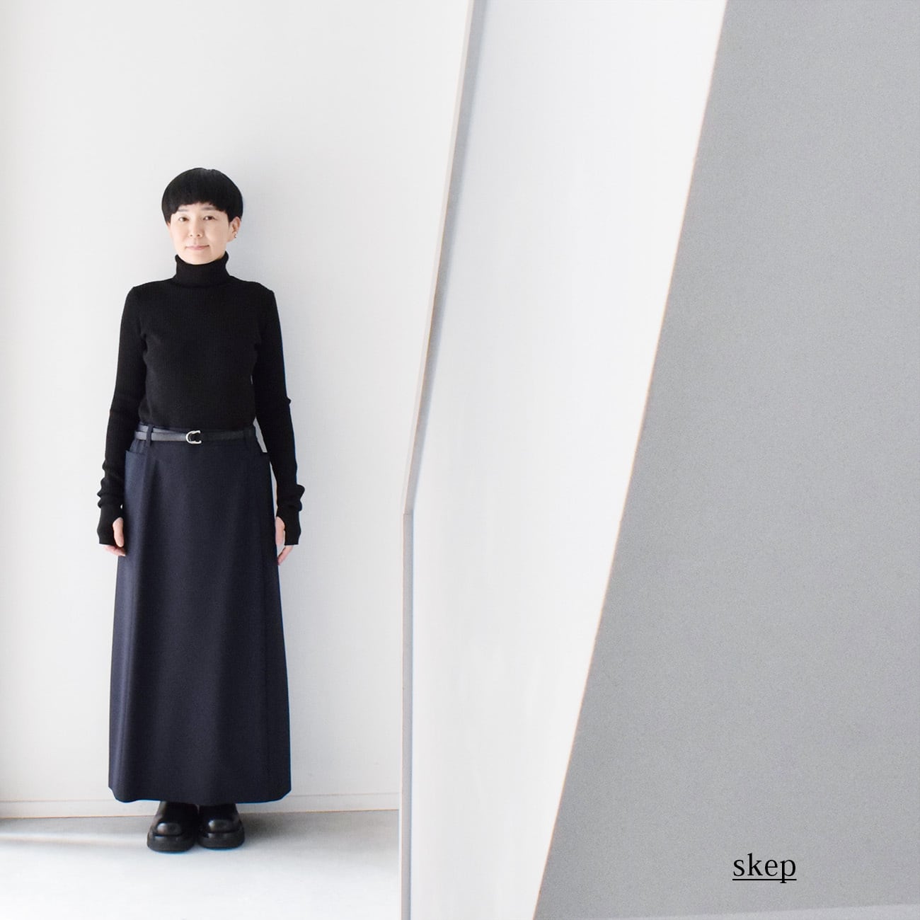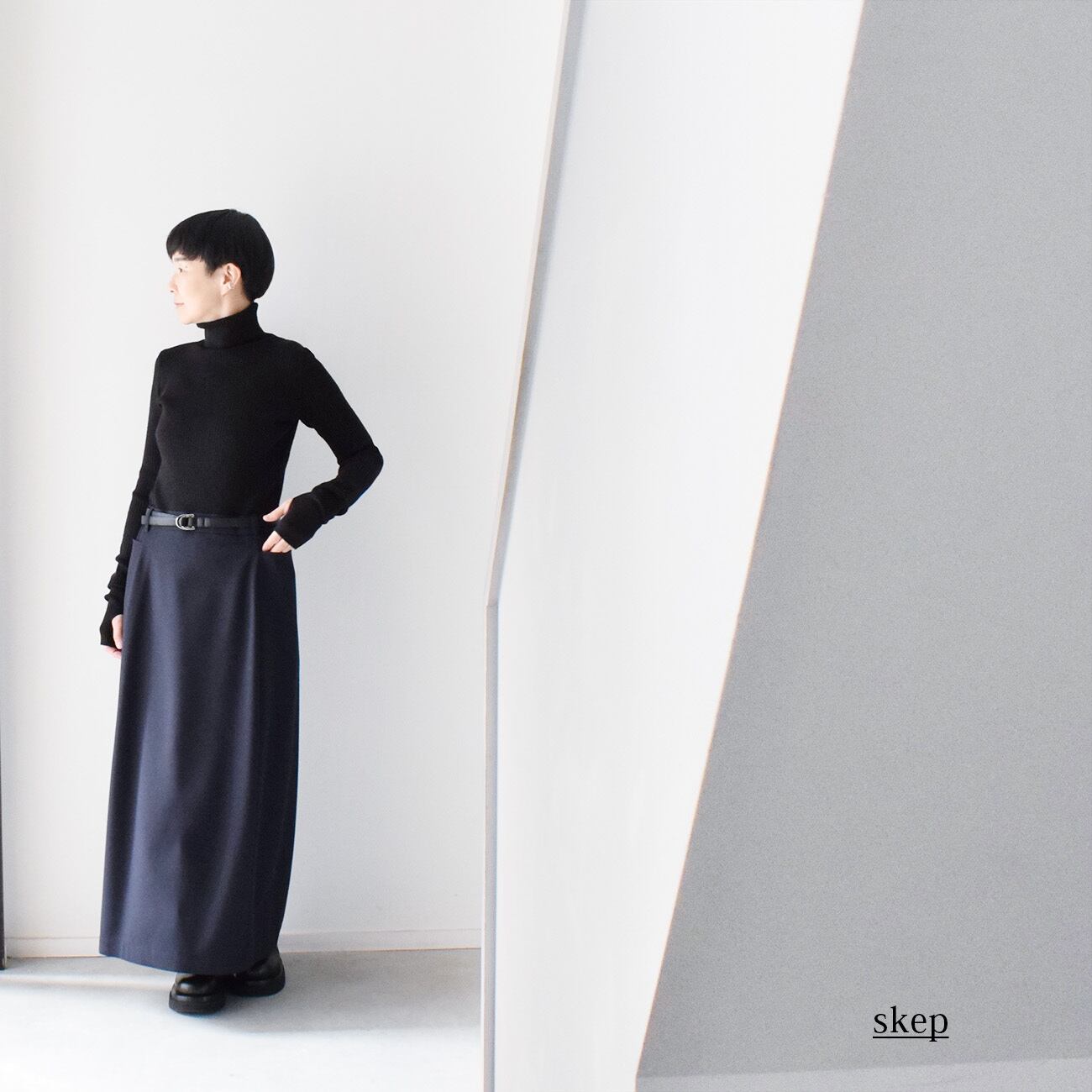 トップスをコンパクトにまとめてスカートにインし、ベルトをしめてローウエストで履いて、足元はトゥが大き目のブーツ、というコーディネートが特にお気に入りです。
