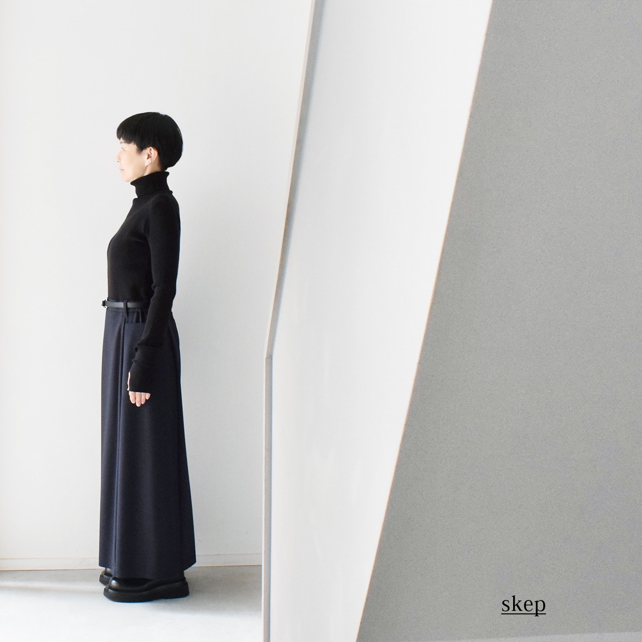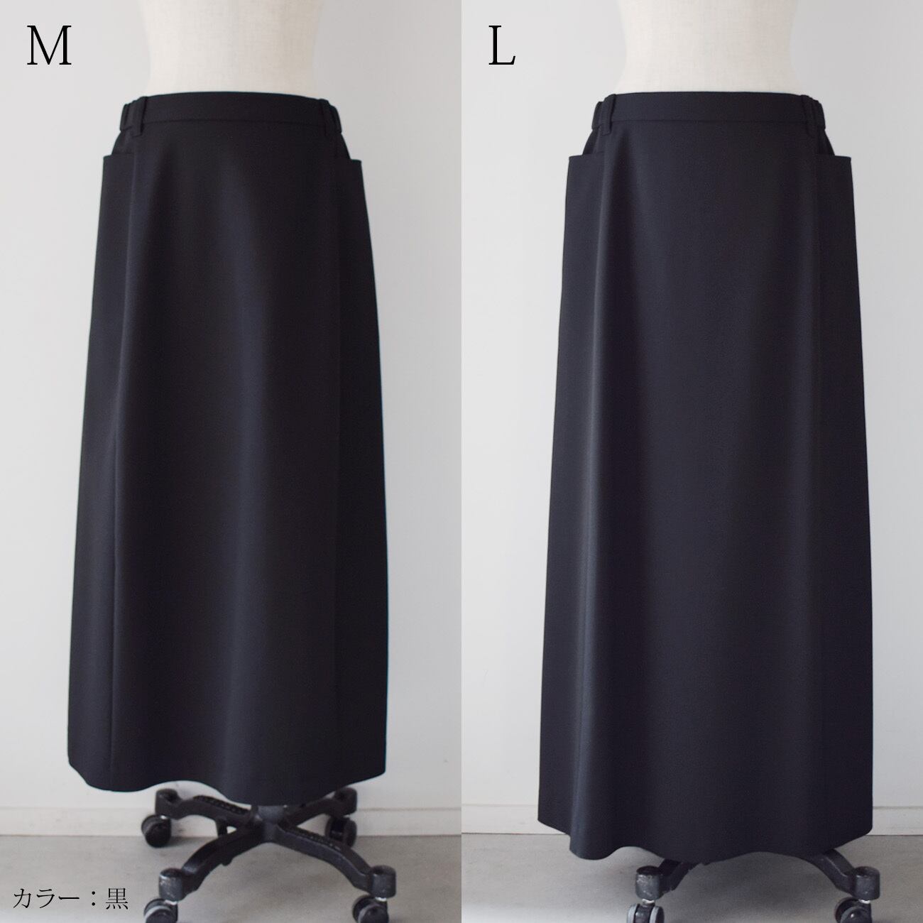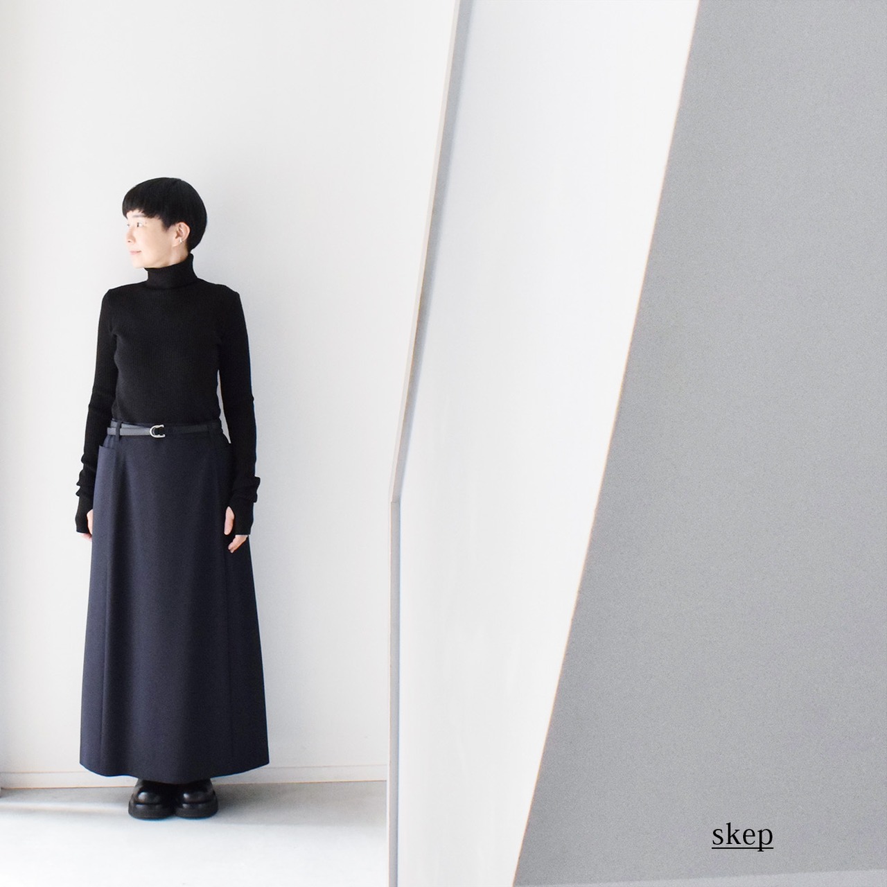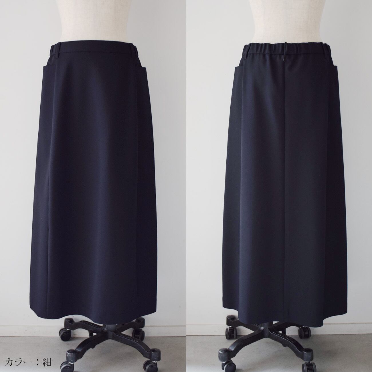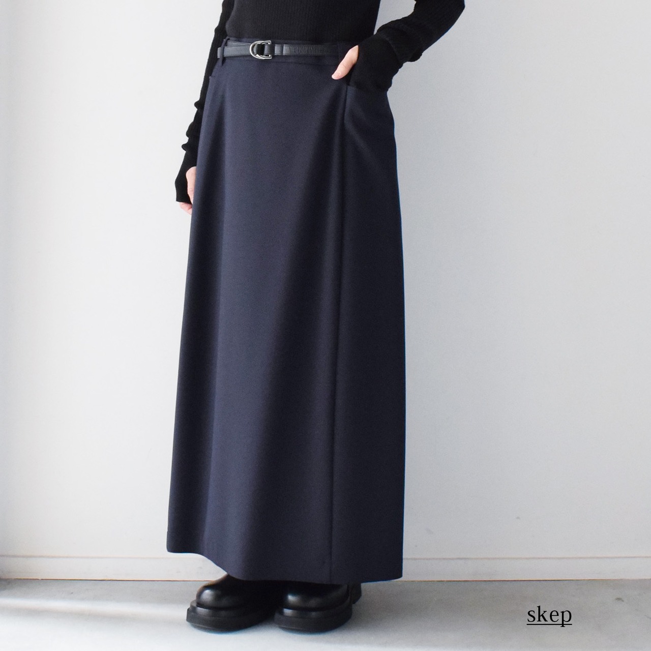 スッキリとしたやや台形のシルエットで、なるべく足さばきが良いようにデザインを整えたロングスカートです。