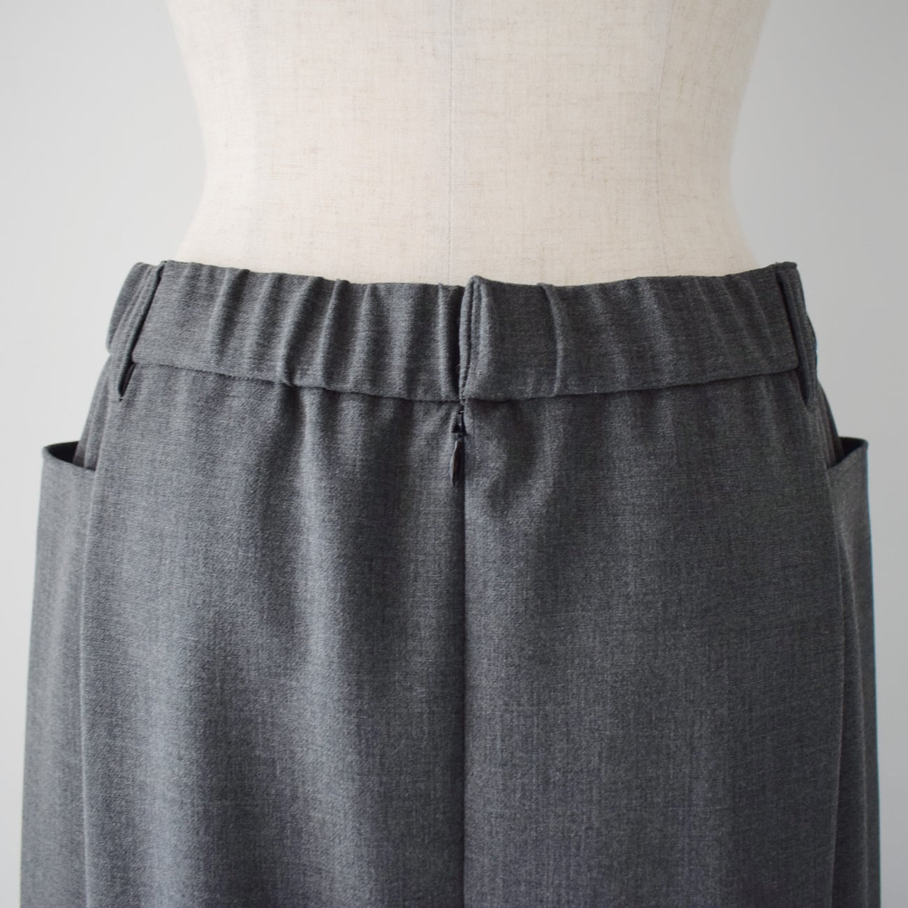 両脇に切り替えを入れることで、動きやすいように生地量は確保しつつ、タイトスカートよりも足さばきが良く、一般的なAラインほど広がらないようにデザインしています。