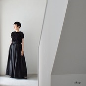 思い切ったボリューム感とウエストから程よく広がるシルエットのロング丈、これに深めのタックとギャザーを併用し、