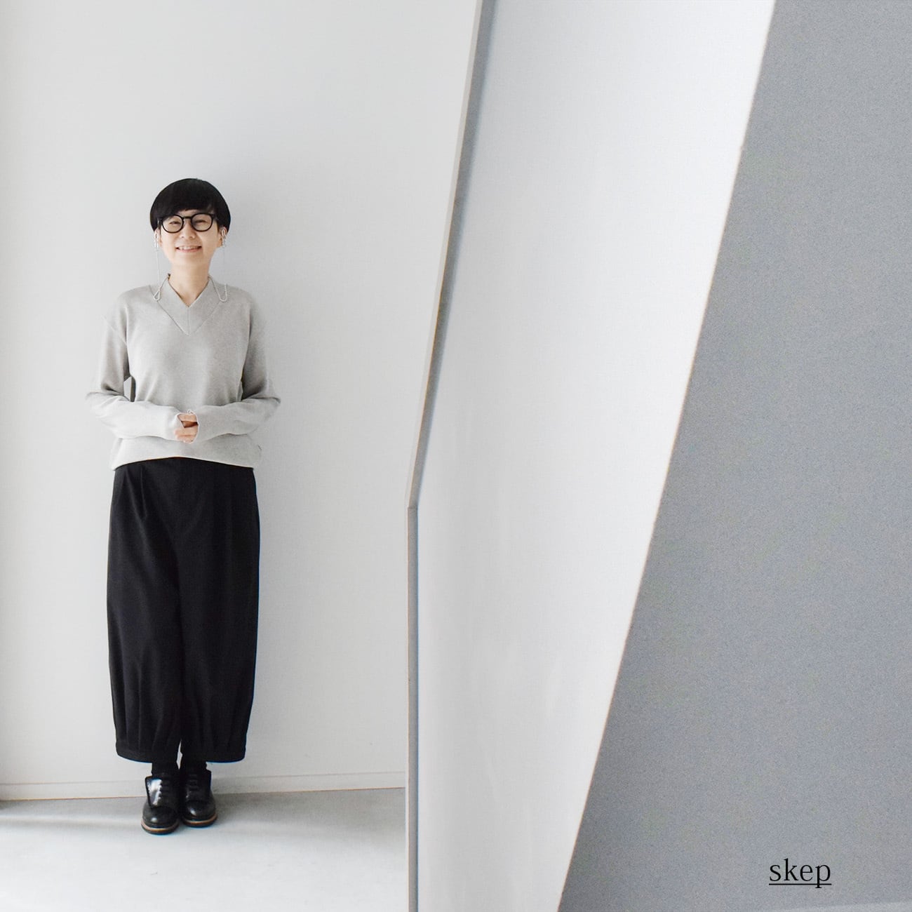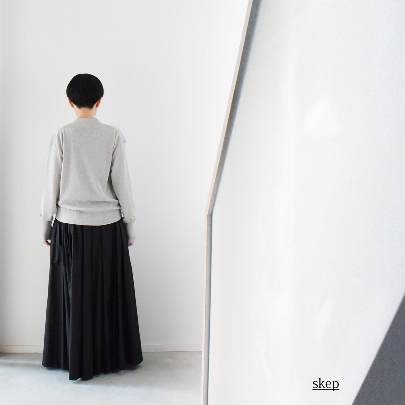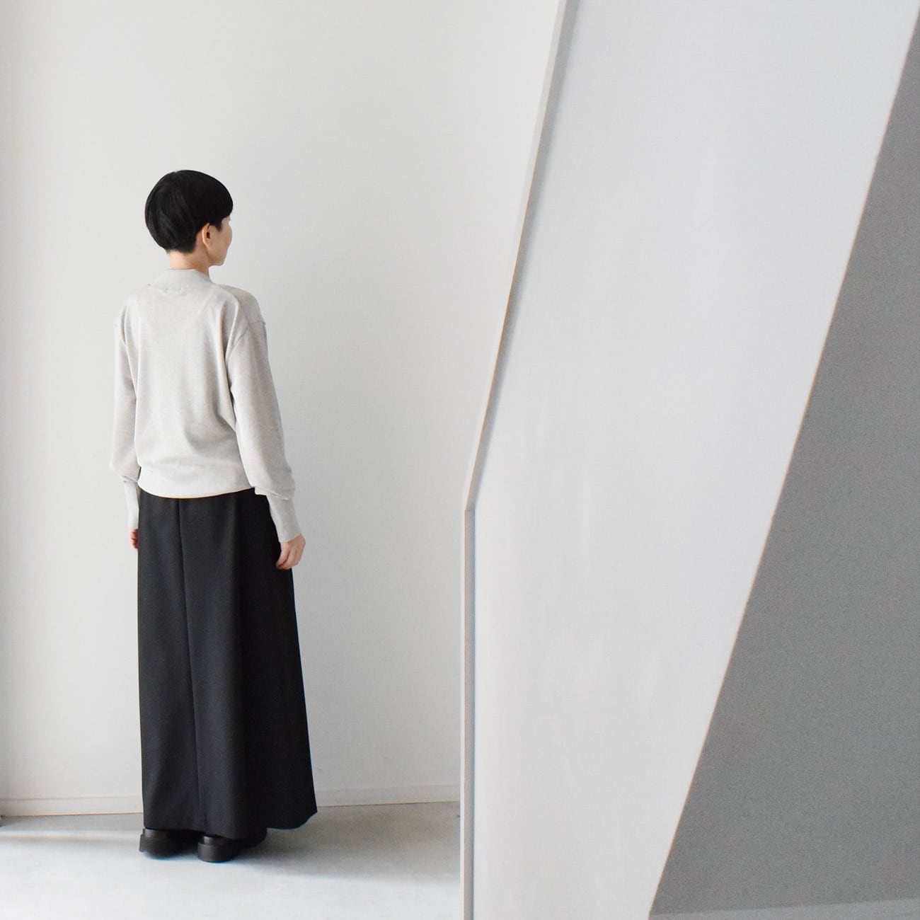 スタッフは、マチありロングスカートや短め丈で裾ベルトのバルーンパンツ、バルーンスカートと合わせて使うことが多く、