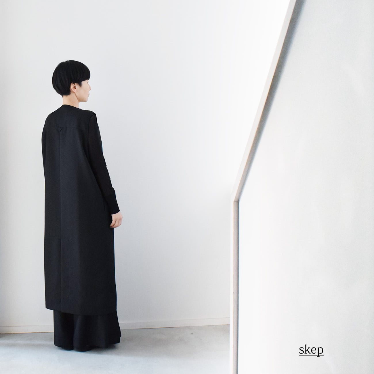 表面がなめらかで、毛羽が少なく、きれいめで品のある、スーツ地のような表情の生地を使い、少しゆとりを持たせたロングのIラインにVネックで、すっきりとシンプルにし、