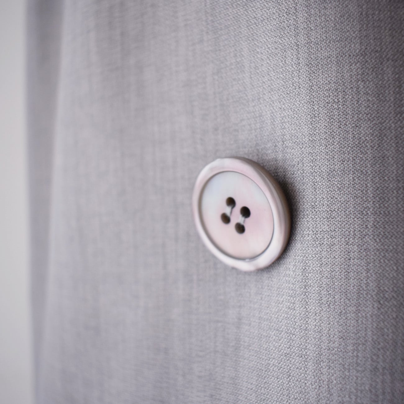 かっこよく決まりすぎてきつい印象にならないように黒のボタンは少し丸味のあるボタンを選び、知的で清潔感のある印象になるように、グレーのボタンは比較的平らで、光沢感のあるボタンを選びました。