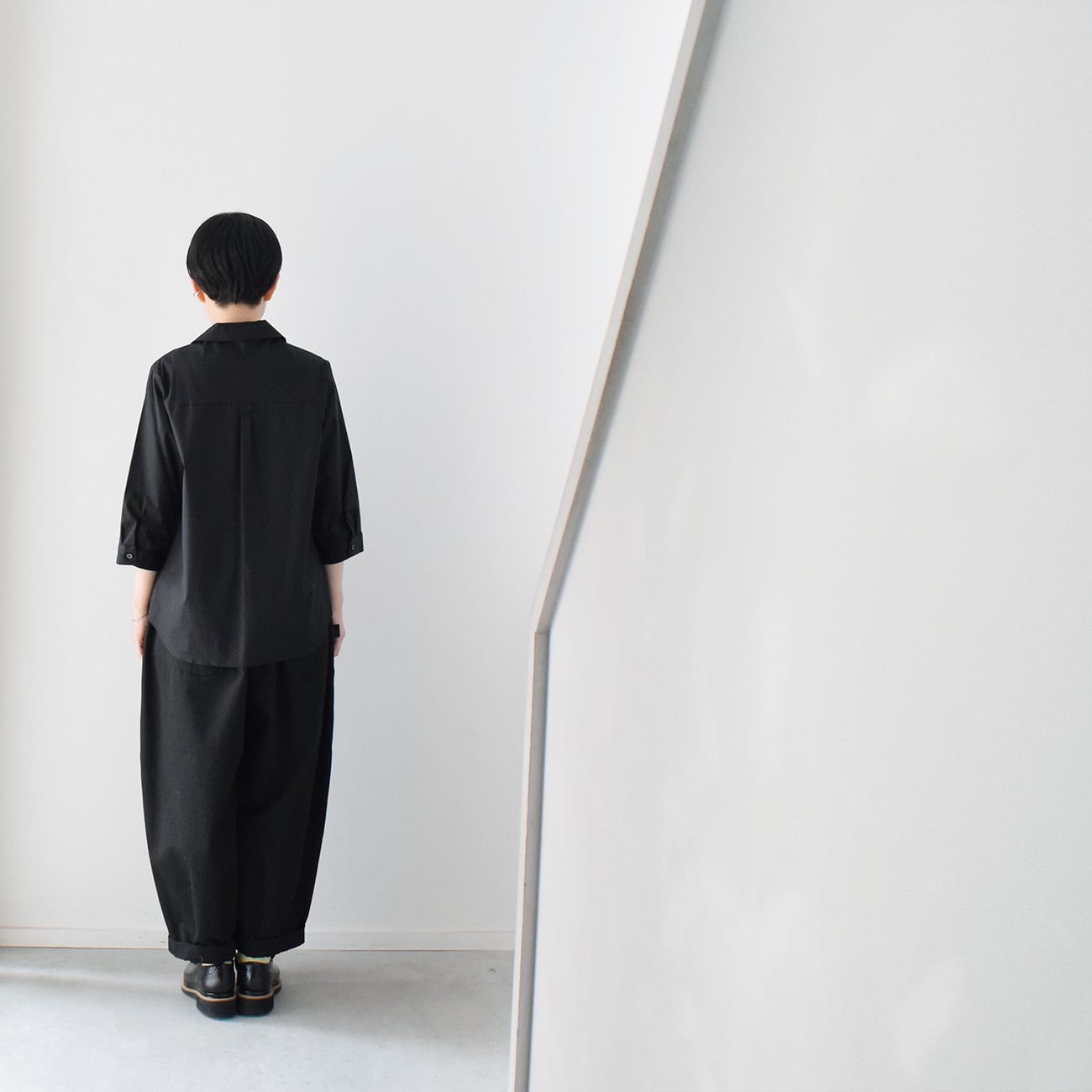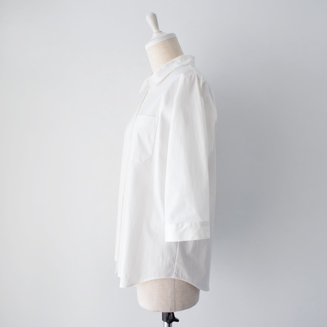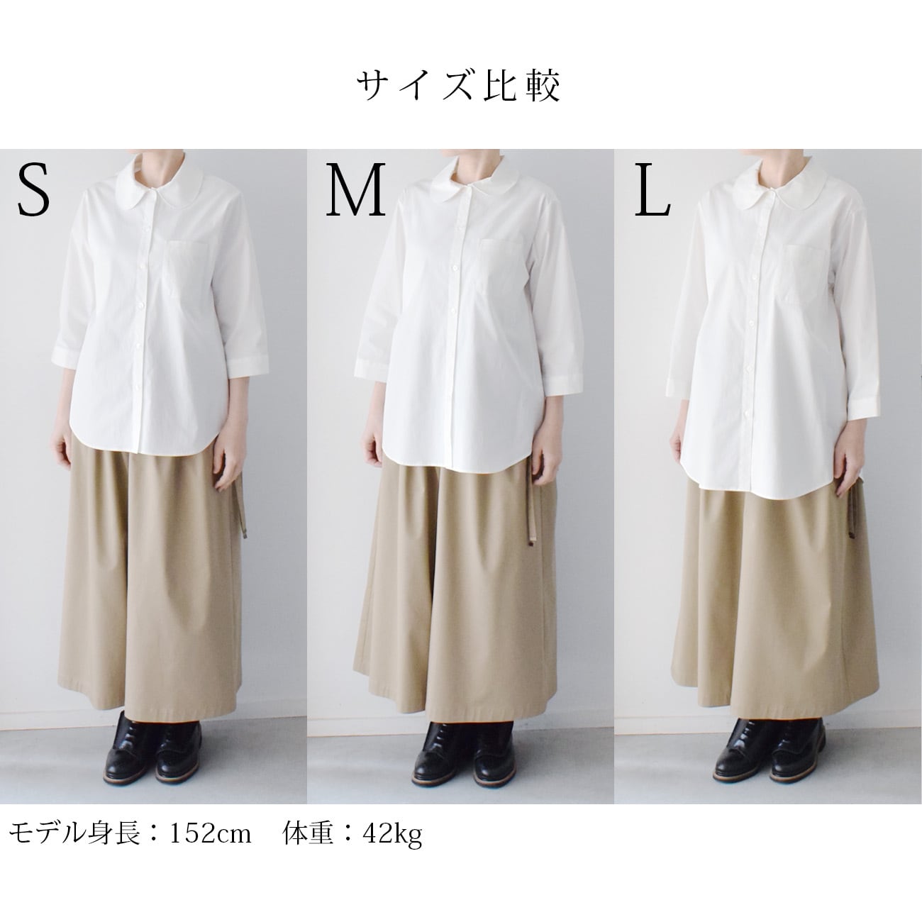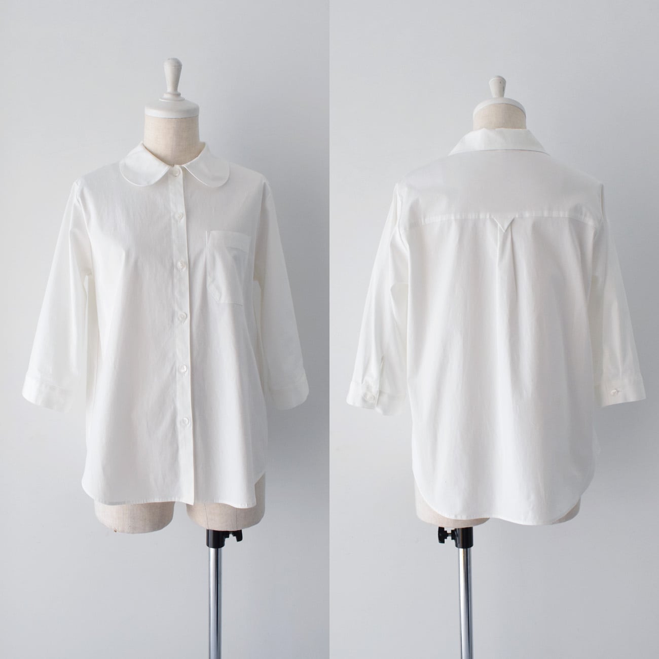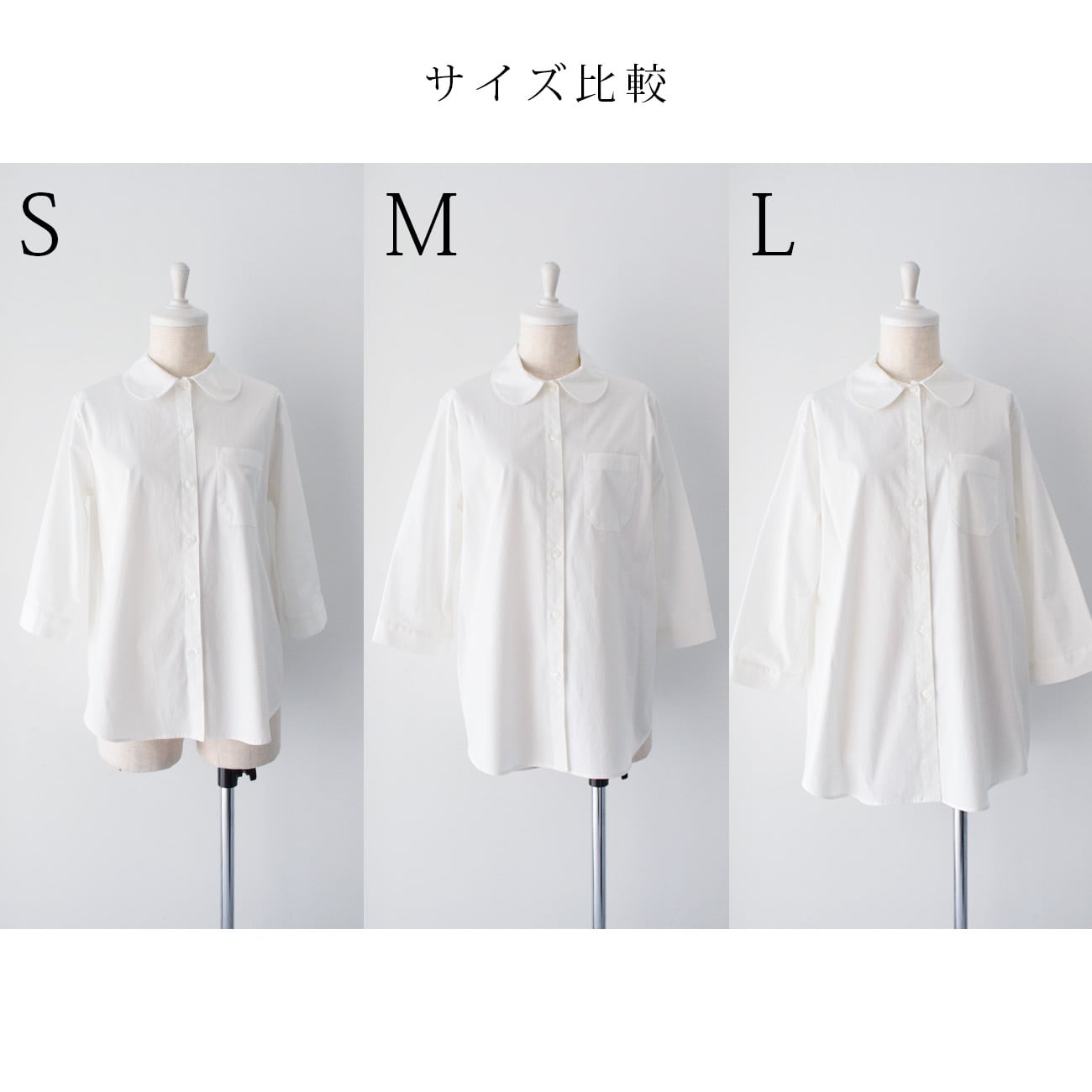 ほのかにAラインのシルエットに大きめの丸襟が特徴的な、七分袖のシャツブラウスです。