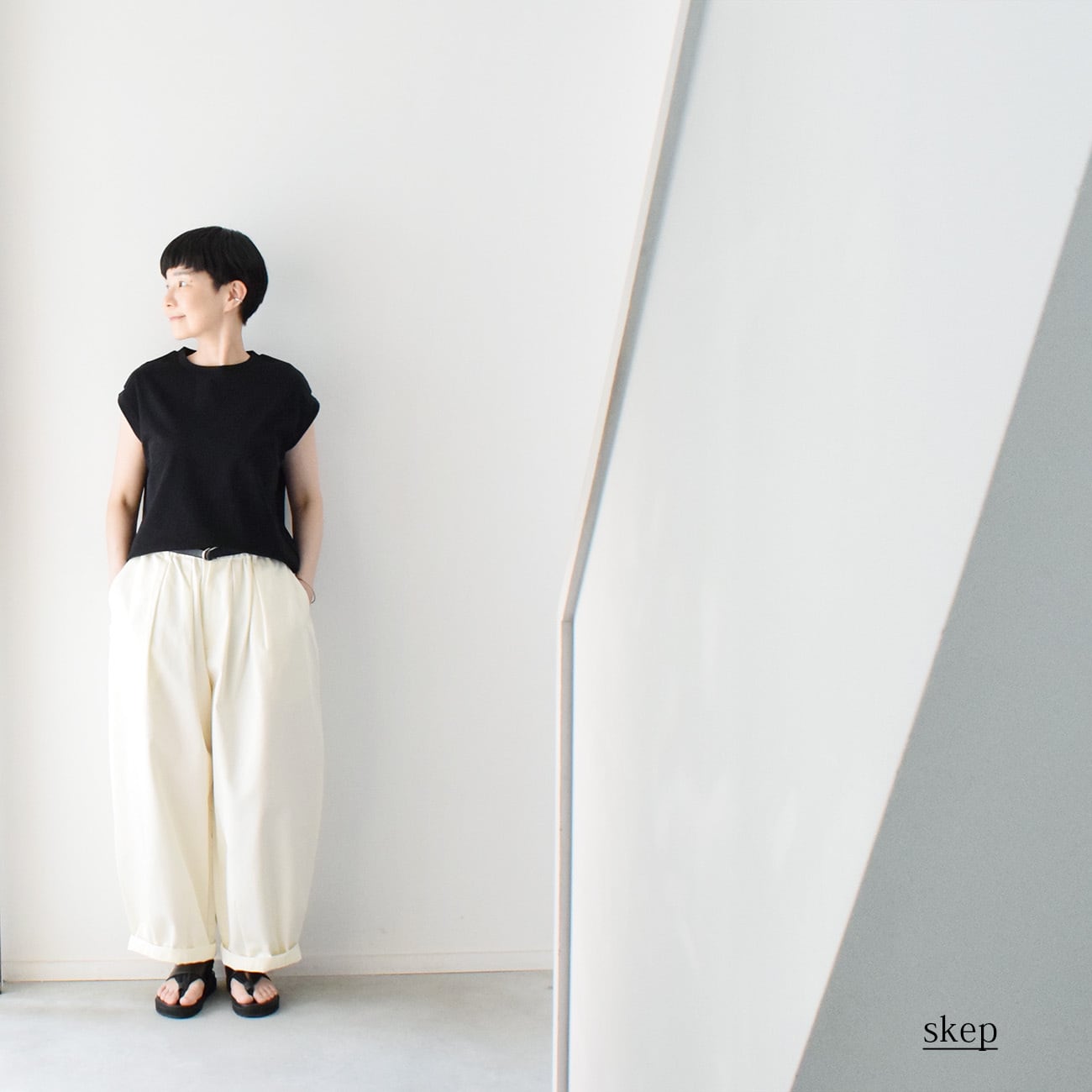 暑い季節には素足にサンダルで足首を見せたり、寒い季節には靴下をレイヤードしたり、ブーツを合わせたりして 1年中履いています。