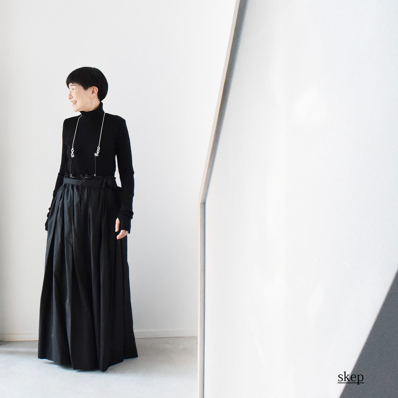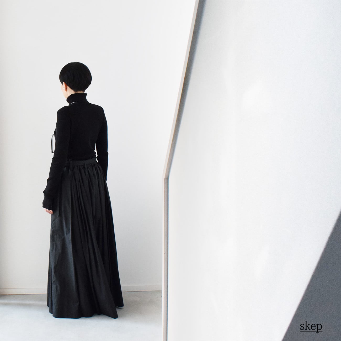 思い切ったボリューム感とウエストから程よく広がるシルエットのロング丈、これに深めのタックとギャザーを併用し、