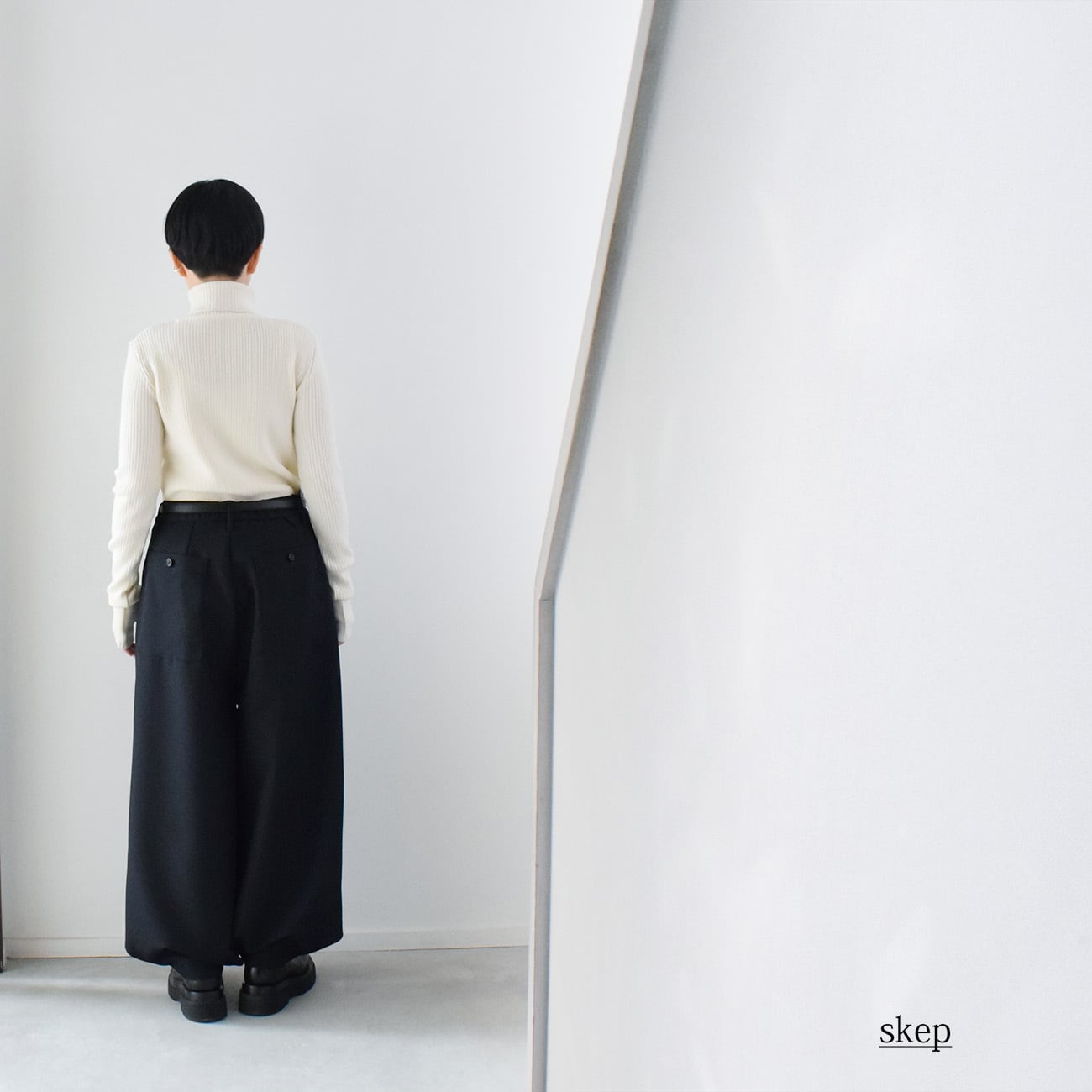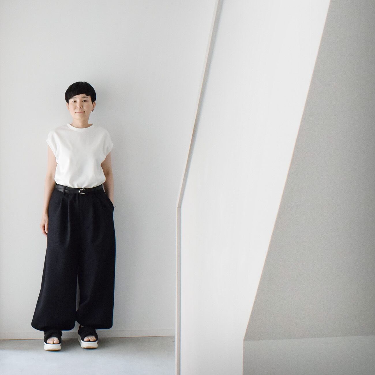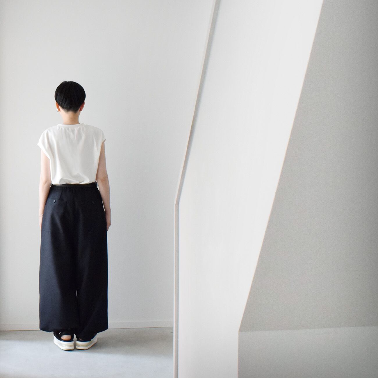 スナップを留めずに履くと適度な広がりのワイドパンツで、