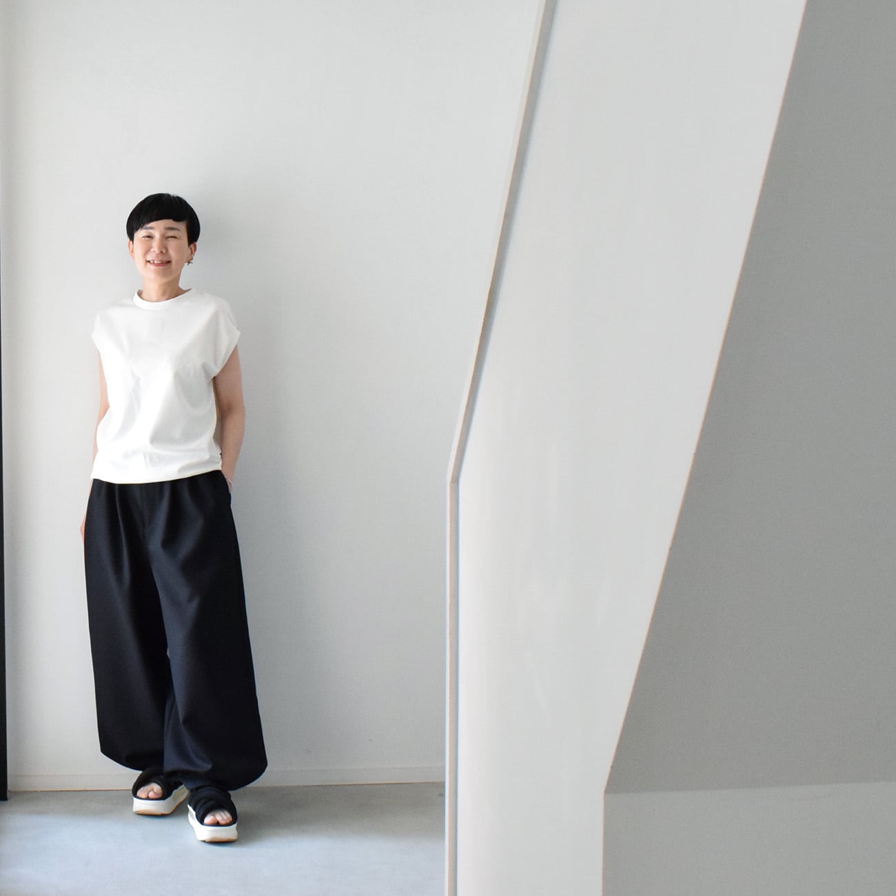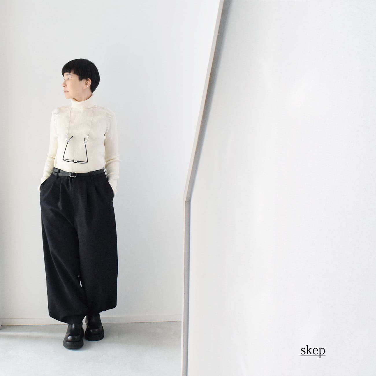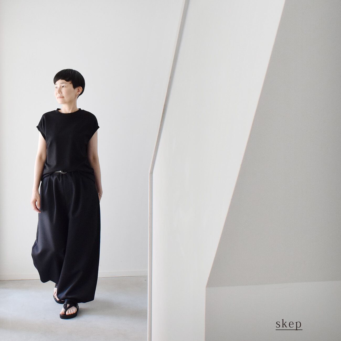 スナップを留めずに履くと適度な広がりのワイドパンツで、