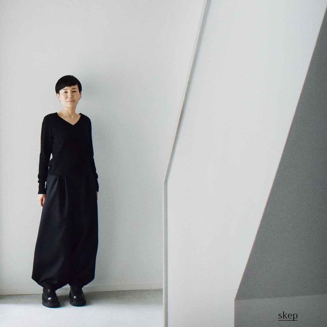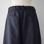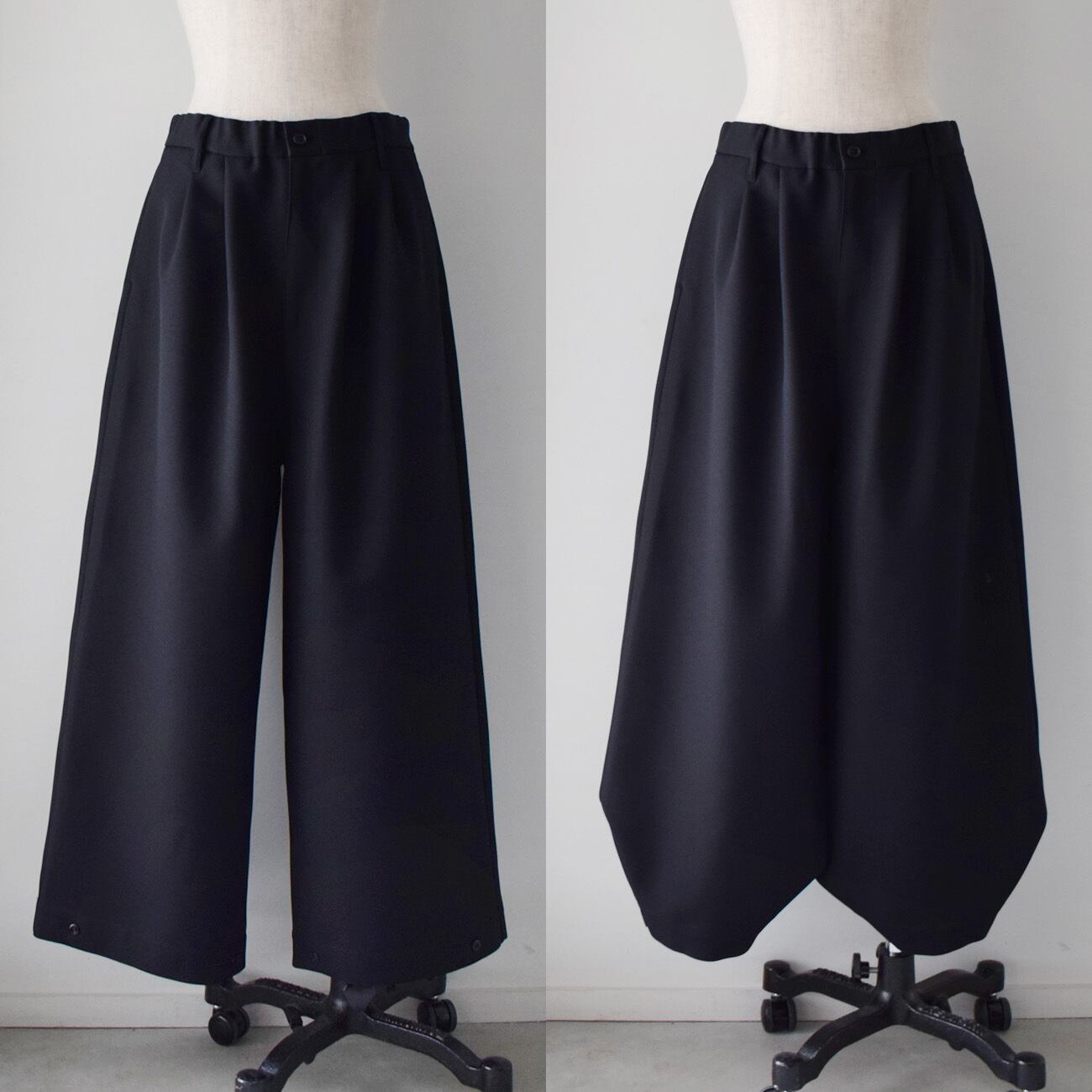 少し個性的なニッカポッカ風のシルエットになるワイドパンツです。