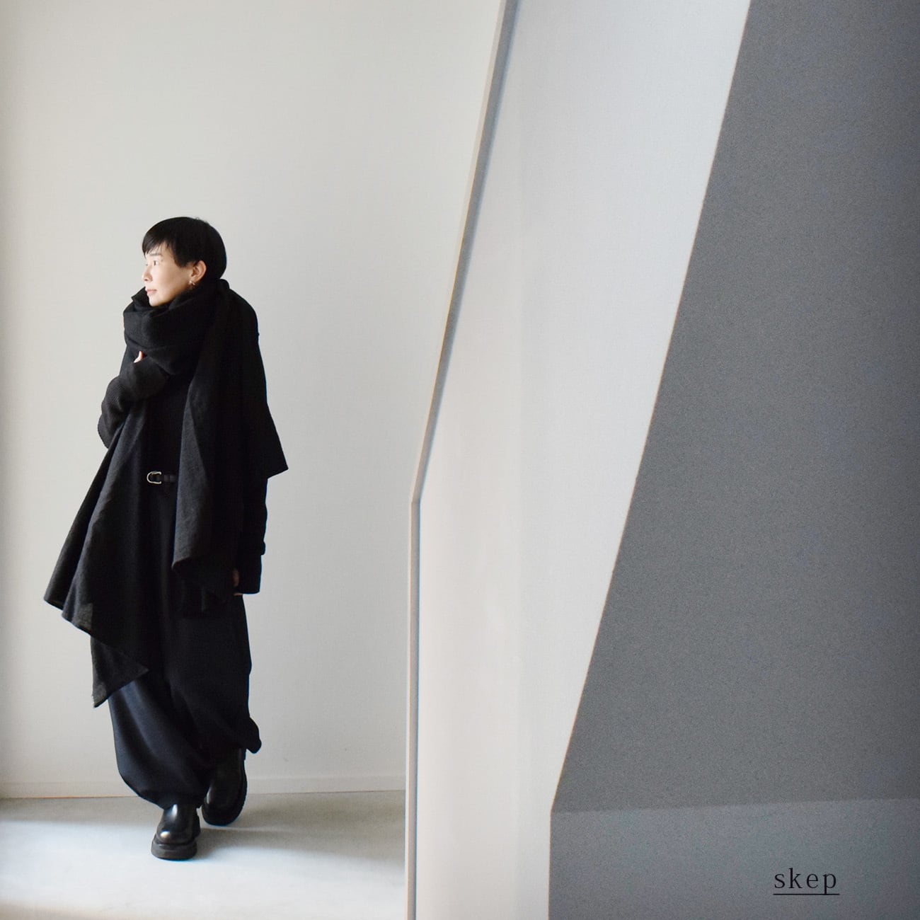 両側のスナップを留めて、留めた部分の生地を外側に広げると、空気をはらんだような、ふくらみを持ったシルエットになります。