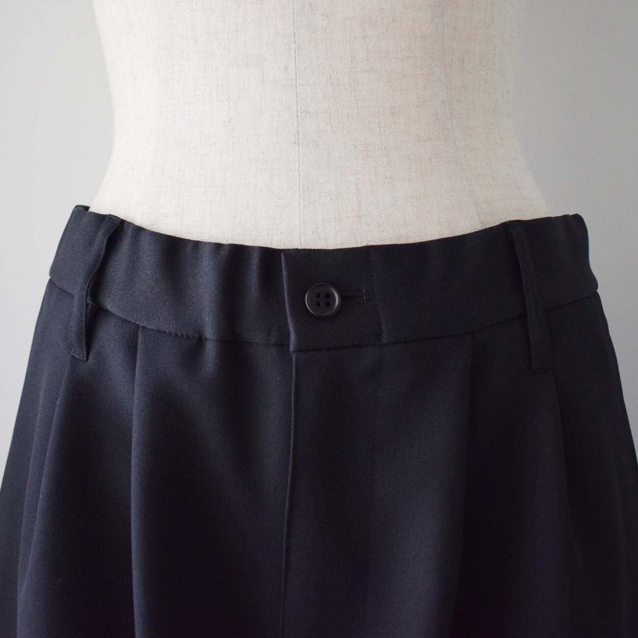 前ファスナー開きで、ウエストベルトは総ゴム仕立てですが、