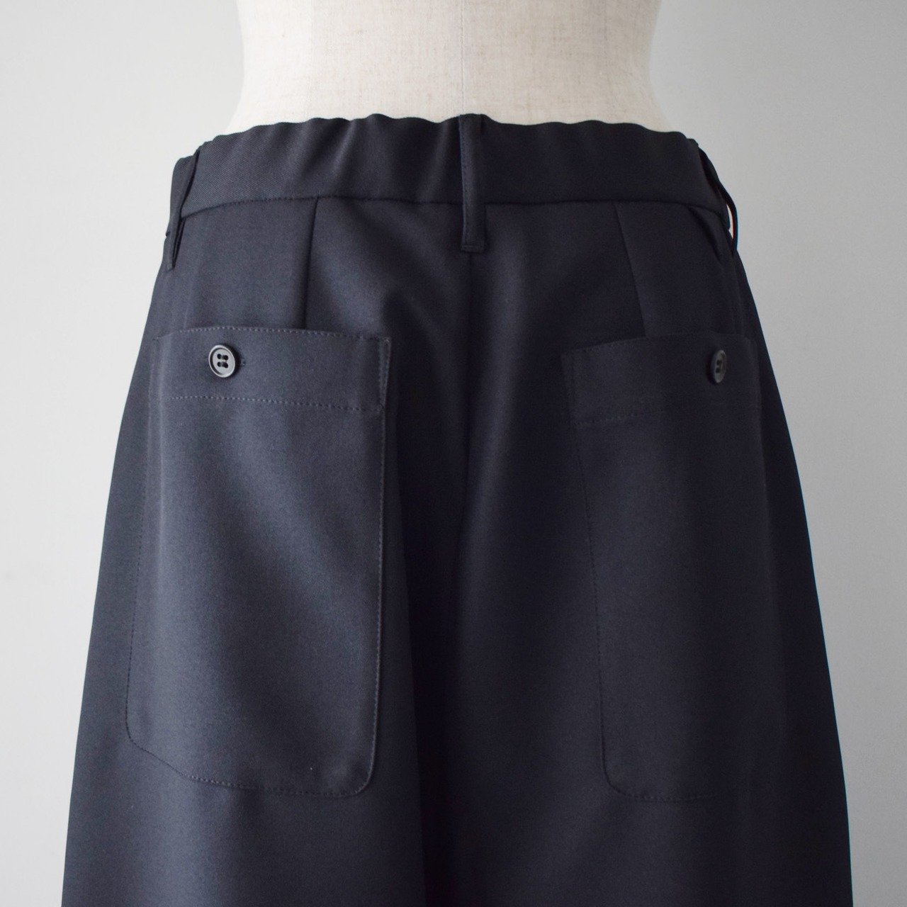 決まりすぎず、少し愛嬌も持たせられるよう、後ろのポケットは大き目のパッチポケットにしています。